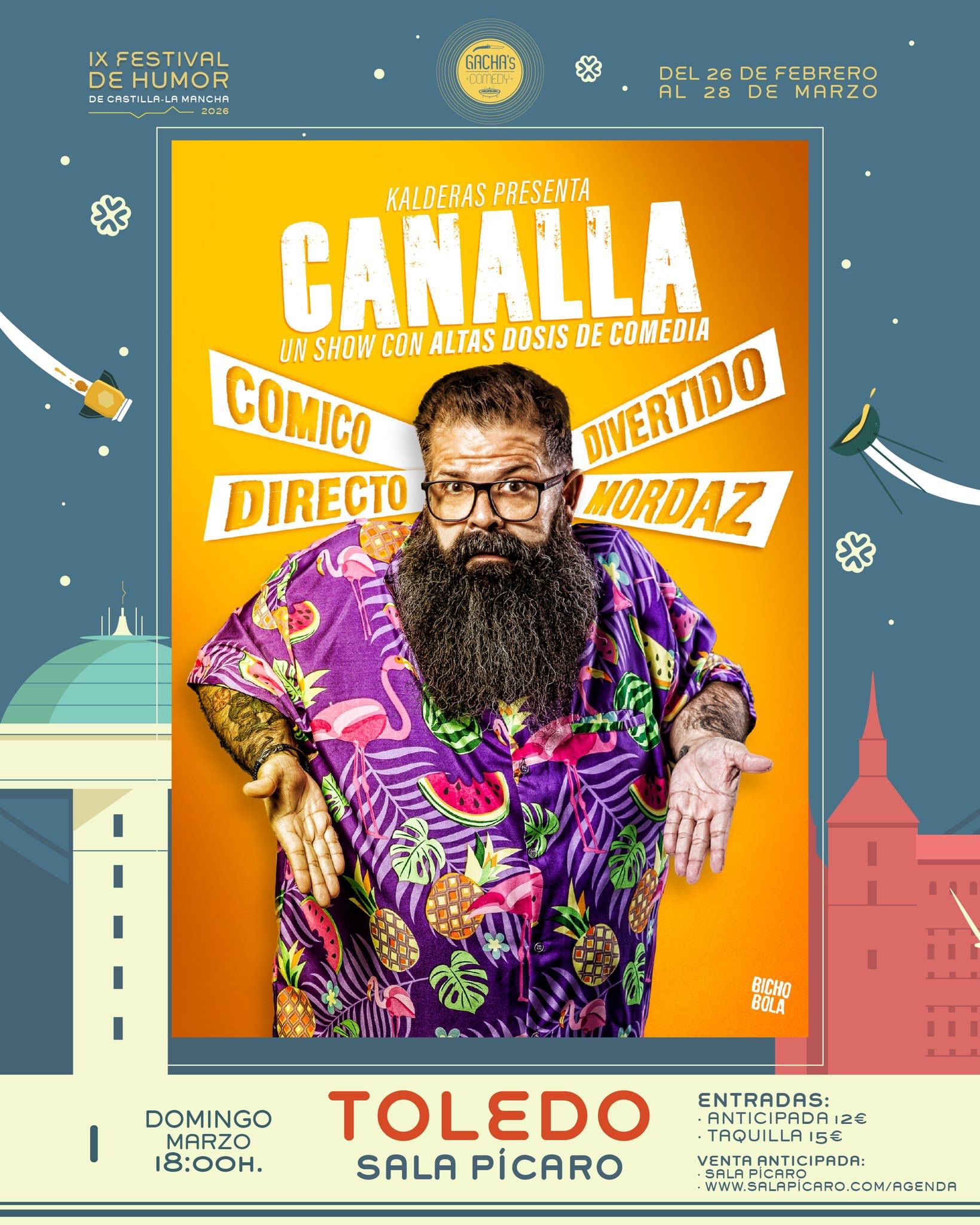 Kalderas es una apuesta al humor exigente, un desafío a la seriedad más exquisita y una oportunidad única para pasar un rato divertido. ¡Eso si, el show se llama «CANALLA»… no es apto para personas sensibles! Así es que si te gusta reírte de la vida y de situaciones de esas que suscitan miradas en la cena de familia, este es tu espectáculo.